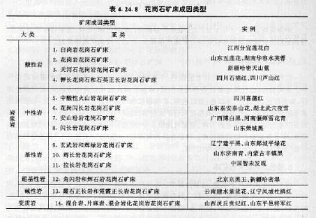 中國http://www.stonebuy.com花崗石礦床類型復雜,種類繁多,以巖漿巖為主,還有變質巖型,按花崗石礦床成因可以分為2大類14個亞類,見表4.24.8。表4.24.8花崗石礦床成因類型
