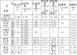 表3列舉了美國ASTM標準對花崗石、石灰巖、大理石、砂巖、板巖五種商業上常見的飾面石材http://www.stonebuy.com/產品http://www.stonebuy.com/sample/材質性能給出的技術指標。從中不難看出ASTM標準不僅對天然飾面石材http://www.stonebuy.com/進行了較詳細的產品http://www.stonebuy.com/sample/劃分,同時對同類產品http://www.stonebuy.com/sample/也根據礦物成份或密度不同進行了等級劃分,并制定了嚴格的技術指標。這對各類飾面石材http://www.stonebuy.com/的開采、加工和使用都會有積極的指導意義。相比之下我國的石材http://www.stonebuy.com/產品http://www.stonebuy.com/sample/標準在這方面還是有一定的差距的,隨著石灰巖、砂巖類石材http://www.stonebuy.com/的廣泛應用,這類石材http://www.stonebuy.com/的產品http://www.stonebuy.com/sample/標準應該成為 業內人士關注的對象.