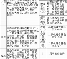 在美國ASTM C119標準中,將天然飾面石材http://www.stonebuy.com/分為花崗石(Granite)、石灰石(Limestone)、大理石(Marble)、砂巖(Quartz-based)、板石(Slate)及其它石材http://www.stonebuy.com/六類(見表2)。