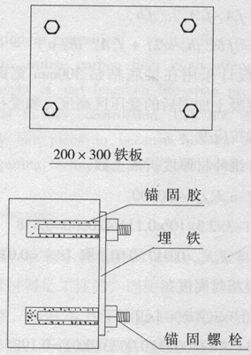 (4)化學(xué)錨固鐵板對在混凝土上的鉆孔直徑要求也是非常嚴格,鉆孔的直徑過小起不到錨固膠應(yīng)該有的作用。通常鉆孔的直徑要比錨桿的直徑大4~5mm,深度為100mm,這樣即能夠使錨固膠與錨桿充分接觸又能夠節(jié)約錨固膠的用量。