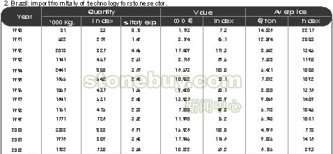 巴西一直以來是一個很好的技術輸入國,其中壓倒一切的多數技術來自意大利,他們在此領域保持著長期互惠的關系。可是正如數值清楚地顯示的那樣,一年與下一年有著相當大的不同,更多的事情是由外部條件而不是由需求決定的。平均價格也有相當大的變化,現在幾乎接近歷史最小值(表2)。這表明在混雜的進口產品http://www.stonebuy.com/sample/中一直缺乏一種同樣的東西,這也與前面所提到的障礙有關。