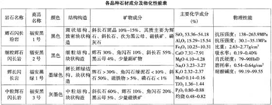 根據地質普查,將礦區石材http://www.stonebuy.com/分為四類品種,即輝石閃長玢巖(福安黑1號)、細粒輝石閃長巖(福安黑2號)、輝石閃長巖(福安墨綠1號)及中粒輝石閃長巖(福安黑3號)。其中以輝石閃長巖體邊緣相的輝石閃長玢巖為主要品種,大面積分布于塘樓下和半山樓巖體的北東部。其次是塘樓下巖體鉆孔中所見的細粒輝石閃長巖及輝長閃長巖,以及兩個巖體中心相的中粒輝石閃長巖,各品種巖石分布特征見前述侵人巖一節。上述四個品種巖石分布總面積約0.6km2 其主要成分及物化性能見下表。
