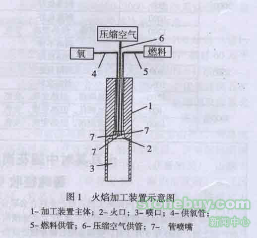 為了達到便于有效地加工石材http://www.stonebuy.com/表面的目的,關鍵在于控制好噴射速度和火焰溫度,因此通過反復試驗證明,對石材http://www.stonebuy.com/表面的噴射速度和火焰溫度分別控制在400~1000m/sec和2000℃~2500℃范圍內。為滿足這些條件,該公司設計出一種專用火焰加工裝置,見圖1。