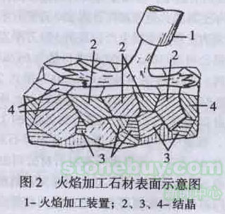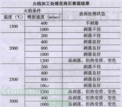 斜身面對石材http://www.stonebuy.com/表面噴射火焰時,接觸火焰的石材http://www.stonebuy.com/表層結晶瞬間熱膨脹,晶格擴展,產生振動,由位于表層中的結晶剝落。因此通過適當速度平行移動加工裝置或石材http://www.stonebuy.com/,可在石材http://www.stonebuy.com/整體表面形成微波凹凸,獲得仿梨皮飾面。下表列出專用火焰加工裝置加工處理花崗石的效果。表中表明,依據待處理的石材http://www.stonebuy.com/的礦物成分,在400~1000m/sec噴射速度和2000℃~2500℃火焰溫度條件下,適當選定噴射速度和火焰溫度對石材http://www.stonebuy.com/表面進行加工處理,其剝落性良好,不熱變質和變色。