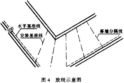 根據土建提供的測量基準點構成的線控制網示意圖,以測量基準點坐標為基準,采用天頂法利用激光經緯儀、鉛垂儀垂直測量,并傳遞至各樓層,在于各層樓面重新測設井字形線控制網,然后將各層井字形線控制網平移至外梁上,作豎向測點聯結,即可建立垂直基準線并由此可構成立面控制網。將立面控制網平移至立面外墻,確定各樓層的墻面位置并做好標記,各層立面以此標記為準,采用鋼絲線確定立面位置(圖4)。www.stonebuy.com