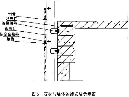 用環氧樹脂注滿槽坑,平穩抬起石板,將槽口對準已固定在橫梁上的扣件緩緩插人,再將另一對扣件插人上部槽內,使石板稍向前傾,令扣件掛上橫梁后,再讓石板恢復到垂直狀態,并將扣件向下壓實,檢查調整石板的垂直水平進出位置,使其符合立面控制線。如圖5所示。