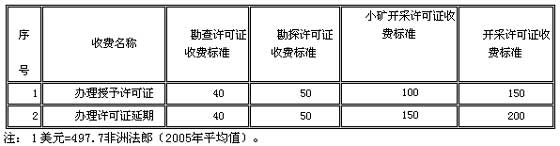 另外在授予或延長各類礦業(yè)許可證時(shí)要交納一部分費(fèi)用(表1)。根據(jù)許可證的面積,一般每年還要交納少量的地租。例如,勘查許可證和勘探許可證第一階段地租標(biāo)準(zhǔn)為每年1000FCFA(非洲金融共同體法郎)/平方公里,第一次更新每年1500FCFA/平方公里;第二次更新每年2000FCFA/平方公里。采礦許可證地租標(biāo)準(zhǔn)為每年10萬FCFA/平方公里;小礦開采許可證每年5萬FCFA/平方公里。