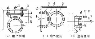 1. 噴嘴 2. 防護罩 3. 絕緣板 4. 陰極塊 5、8. 砂輪 6. 電極 7. 電刷 9. 工件 10. 卡盤