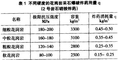 不同硬度的花崗巖采石爆破炸藥(2號巖石硝錢炸藥)用量q(單位為kg/m3)見表1。