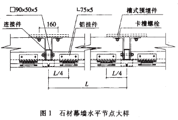 幕墻主要由骨架、石板和連接件組成。骨架由鋼方管和角鋼連接而成,用吊掛方式安裝在主體結構上,骨架上下一般在各層結構標高以上0.28m處連接,設寬20mm的縫隙,并用芯件插接,層高大于4m時在樓層中間增加一道連接,并相應增加一個支座。骨架通過鋁掛件短槽式預埋件支承石板。幕墻的構造形式如圖量所示。