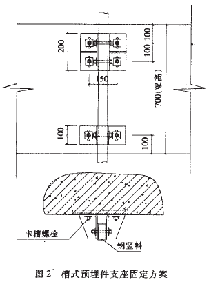 (5) 預埋件采用經改良的哈芬槽,后置埋件以HIT-HYl50化學螺栓、慧魚膨脹螺栓與主體結構連接。