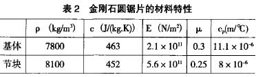 在實際應用中,熱膨脹所引起的熱應變和高速旋轉時離心力所引起的應變是影響鋸片基體使用情況的主要因素之一,因此必須同時解決結構和溫度場的相互作用,即熱一結構藕合問題,并給出所施加的溫度場分布和旋轉角速度所引起的結構應力問題。一般禍合場的分析最終可歸結為兩種不同的方法:序貫禍合方法和直接禍合方法。對于不存在高度非線性相互作用的情形,序貫禍合解法更為有效和方便,因此本文采用這種方法進行計算。