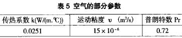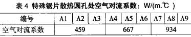 根據文獻的研究,普通鋸片工作時轉速及各部分空氣對流系數:鋸片基體直徑為?350mm,內孔直徑為小?50mm,厚度為2mm,鋸片工作轉速為1000rpm(即鋸片每轉一轉為0.06s);鋸片直徑在[50, 150] mm區間范圍為層流,空氣對流系數約為λ = 9.30 W/(m.℃ ),直徑在[150, 350] mm區間范圍為紊流,空氣對流系數 λ=22.10 W/(m. ℃),窄水口處的空氣對流系數為690 W/(m. ℃),再根據經驗公式可以算得散熱圓孔處空氣對流系數如表4所示。
