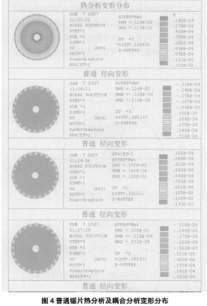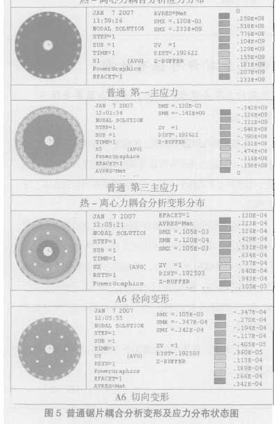 圖4為普通鋸片熱分析和熱一離心力藕合分析變形分布對比,圖5為基體開空冷圓孔鋸片和普通鋸片熱一離心力藕合分析應力及變形分布對比。中國http://www.stonebuy.com石材http://www.stonebuy.com/網