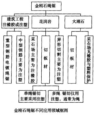 金剛石繩鋸具有各種不同的應(yīng)用范圍。主要可分成在大理石、花崗巖和建筑工程中的應(yīng)用,進(jìn)一步分類可見(jiàn)下圖。石材http://www.stonebuy.com/機(jī)械http://www.stonebuy.com/machine/新聞資訊