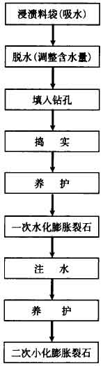 3.裂石方法是將料袋預先用水處理,使其含有生石灰水化量40%-70%的水,填入鉆孔中,進行部分水化,待被裂石體快開裂時,再注入剩余部分的水,進行二次水化,直到裂石操作結束。其裂石流程圖如下所示。