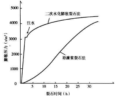 使用由CaO、高鋁水泥和Ca(OH)2水化膨脹性粉料組成的裂石劑時,在浸漬→脫水→填孔→搗實的過程中,高鋁水泥與Ca(OH)2先反應,出現急凝和硬化。這時雖對防止噴漿有效,但膨脹壓力尚還不夠,不過隨后隨著先受到反應調節劑抑制的CaO的反應,膨脹壓力隨之增大,大幅提高裂石力。