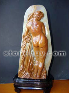 壽山石雕刻家林忍英依形相石,利用壽山山秀園石的巧色,采用科學的透視法和色彩學,以高浮雕的技藝,傳統的寫實手法,理智地進行構圖,運刀流暢、有力,使《浴女》形象更具立體感,逼真肖似。這件作品突出的是婉轉流暢的背部線條、血色充盈的肌膚和高貴優雅的身姿,依然給人以強烈的視覺沖擊和很高的藝術享受。表現了女性的優美、纖美、婉媚之美、陰柔之美。