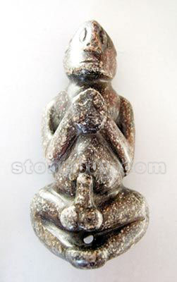 這兩件雕件是翁旗民間收藏愛好者張軍的藏品,米白色的巴林石女神雕像象征著紅山先民女性生殖崇拜,高7.5厘米,寬3.5厘米,表面露雞血,刻畫的是孕婦形象。另一件紅黑色巴林石雕件高10厘米、寬4.5厘米,是一件男性生殖崇拜雕件。www.stonebuy.com