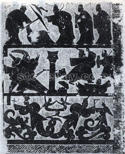 社會生活類畫像:有車騎出行、樓閣尊居、宴飲皰廚、樂舞伎戲、水陸攻戰等內容。這類畫像內容主要是為了表現祠主生平的官宦地位和豪華生活。如第四石長達3.5米,高0.5米的車馬出行隊列儀仗,按照《后漢書?輿服志》所載車騎出門制度之規定,從“此丞卿車”“君為郎中時”等榜題,與墓室主人生前官位相符。《水陸攻戰圖》不僅描繪了犬馬交錯,混戰廝殺的激烈場面,而且也表現出有條不紊的作戰指揮系統,展現了車馬、戰船及刀、槍、劍、戟、長矛等多種兵戈器械,為研究古代軍事戰爭提供了有力的佐證;石刻中宴飲皰廚、樂舞伎戲畫像,反映了漢代歌舞百戲的繁榮,樂器種類繁多,對研究古代樂器形制、演奏方法、樂隊組合等,提供了豐富的資料。比如,以前有種說法,嗩吶乃印度流入中國http://www.stonebuy.com的,而武氏祠畫像石則改寫了此論斷,并把嗩吶的歷史往前推了至少600年。m.oacwf.cn