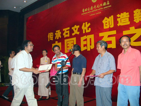 杭州收藏家黃麟貴參賽印章"青田封門燈光凍"獲得一等獎,杭州季進雄的"昌化田黃"、趙曉偉的"青田封門石"和北京葉偉中的"巴林女兒紅"等三件作品獲二等獎。寧波吳君達的"青田封門三彩石"、蘇州林加俊的"昌化朱砂凍"、青田杜伯榮的"青田金玉凍"、青田孫紅軍的"壽山芙蓉"、杭州黃麟貴的"巴林石套章"和蘇州林加俊的"青田封門對章"等六件作品獲三等獎。來自臺灣臺北蔣敏雪的"青田封門青"、臺南楊耀生的"昌化雞血石"、上海徐偉展的"青田藍星"等20件作品獲優秀獎。
