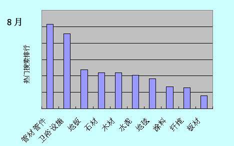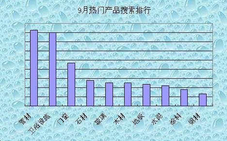 以上三幅圖,可以大致看出,從七月至九月,排名靠前的總是管材和衛浴設施,管材向來是建材行業搜索最熱的一個,是工程建設和家庭裝修中經常用到的建筑材料,它無可厚非的長期占據搜索排行榜的榜首。