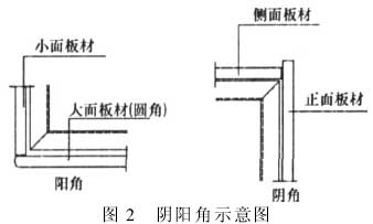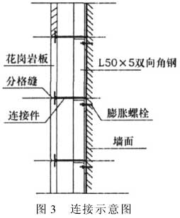 在花崗巖板上下面用無齒鋸開口,開口見圖1,陰陽角示意圖見圖2,開口長50mm,深20mm,開口內巖石粉末清理干凈,并注入樹脂膠,用專用掛件將花崗巖板與角鋼龍骨固定,掛件一端連接板材,另一端與角鋼焊接,見圖3。