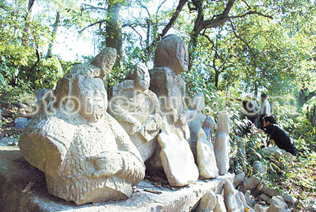 這里滿山都是石刻人像。像態(tài)或立或蹲,或坐或仰;像高的有幾尺,矮的只有寸把;有的像懸在樹上,有的藏于樹蔸,有的埋在地下,有的躺在水中。據(jù)不完全統(tǒng)計,嶺中的石像在萬尊以上。石像中,有的是手持朝笏神色莊嚴(yán)的文官,有的是躍馬仗劍威風(fēng)凜凜的武官;有的是強壯雄健的男性,有的是大腹便便的孕婦……除了裸露在地表的近千件石像外,更多的石像深埋地下,有的深度在2米以上。其堆積特點極其明顯,按時代先后依次堆積,順序清晰明朗,越往地下年代越久遠。因山上擁有眾多石雕的“小人”,而當(dāng)?shù)厝擞H昵地稱小人(孩)為“鬼崽崽”,也就叫此山為“鬼崽嶺”。