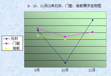 上圖中,石材http://www.stonebuy.com/、門窗、地板在10月有一個下降的走勢,分析原因,與10月的黃金周有關,10月的7天假期會影響建材市場http://www.stonebuy.com/enterprise/FuJian/QuanZhouShi.html的走勢。但整體來看,9月、10月市場http://www.stonebuy.com/enterprise/FuJian/QuanZhouShi.html對門窗的需求要比地板高,石材http://www.stonebuy.com/市場http://www.stonebuy.com/enterprise/FuJian/QuanZhouShi.html不如地板市場http://www.stonebuy.com/enterprise/FuJian/QuanZhouShi.html火,到11月石材http://www.stonebuy.com/有一大幅度升高,成為11月最大的靚點。m.oacwf.cn