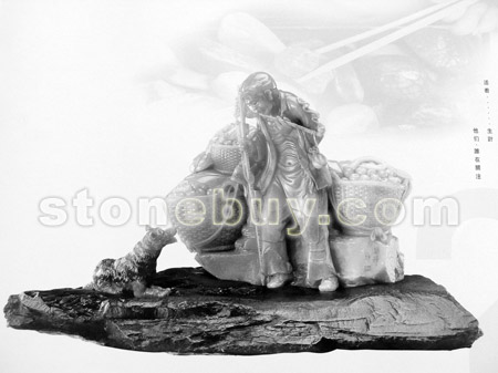 藝術(shù)要關(guān)注人生,《果農(nóng)的煩惱》立意就高。作品中的果農(nóng),一手拄桿秤,一手持旱煙桿,身后疊積著裝滿蘋果的籮筐。果農(nóng)滿面愁容,他在路邊焦急地等待,等待收購蘋果的客商,可左等右等客商就是不來,連狗都等不耐煩了,張嘴對(duì)著主人汪汪叫。果農(nóng)年 行已大,生活艱辛,肋骨歷歷可數(shù),空腹深陷肚皮層迭,褲管還打著補(bǔ)丁。藝人通過作品提請(qǐng)世人留意,增產(chǎn)不增收給農(nóng)民帶來的煩惱,這種煩惱好象希臘神話中“息息法斯的勞動(dòng)”那樣無奈。苦惱人無可奈何的神態(tài)刻畫得很到位,狗的毛色也恰到好處。