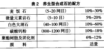 在人造合成石的用料中刻意地配加一定量的富含微量元素與活性元素的巖石,并壓制成類如洗面盆、浴缸、盛水器皿,或壓制成小磚塊再珠聯璧合成坐墊、涼席以至對合成玲瓏球等,其目的在于以其形體構成與人體接觸的條件而發揮其潛在的養生效應。由于這種曲面形的成型產品http://www.stonebuy.com/sample/在后續工序中要進行其彎曲形體表面的研磨拋光,因此其配料中要避免高硅石料的過量使用。其配方見表2。