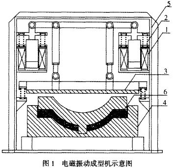 這種高頻的半波電流控制的電磁鐵,在脈動電流的控制下間斷的產生向下作用的吸合力,經由傳動桿使其壓具(3)向下運動而產生瞬間的壓制力;位于電磁鐵上部與壓具側邊的兩組壓縮彈簧,在電磁鐵中部的動鐵心吸合時儲存了能量,并在其失電時用彈簧的反彈力將其升起,由此電磁力壓下而由彈簧力抬起的配合并交替作用的方式而產生高頻的激振力。所述的模具是用金屬并以陶瓷面盒為原形澆鑄成的分為陰模與陽模的承壓模型。
