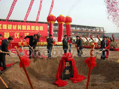 在喜迎鄭州高新區建區十九周年之際,2007年10月31日,鄭州高新區超硬材料制品創業園開工奠基儀式隆重舉行。高新區管委會副主任翟幸福、耿光平等領導班子成員、相關部門負責人以及施工方、業主代表等100余人出席了開工奠基儀式。奠基儀式現場,彩旗飄揚、彩門高拱、彩球高掛、鼓號齊鳴,一派節日的祥和熱鬧景象。www.stonebuy.com