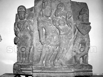 這是表現印度教主神毗濕奴與其愛妃拉克希米的一組雕像。像高71.4厘米,寬74.5厘米,厚21厘米,石灰巖質。毗濕奴頭戴王者花冠,佩寶石和圣線項圈,纓絡自肩及膝、臂、手、足均有佩飾。神色安詳,擁妻而立。其妻子手持蓮花,右手搭于毗濕奴右肩,佩飾與毗濕奴相仿。發髻式樣獨特,戴蓮花花冠,神情怡悅。兩人身體呈現“S”形,毗濕奴的左側立一持花肋儔,神態嫻靜,拉克希米右側立一吹笛神女,神情專注,是典型的十世紀左右印度教的雕塑作品。