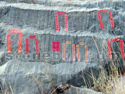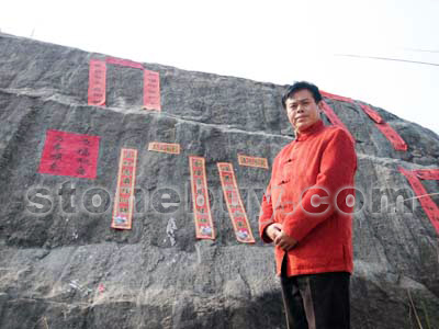 2008年農(nóng)歷正月初三,人們都還沉浸在濃濃的春節(jié)氣氛之中,我和家弟李勁松相約從三和居出發(fā)去漢江支流的堵河下游覓石。上午,我們經(jīng)過尚未完全融化的冰雪,穿越武當山隧道,驅車115公里來到十堰市境內(nèi)的堵河下游,在將要到達最佳覓石點時,勁松發(fā)現(xiàn)了一巨石旁的觀景亭,我放慢了車速,進入眼簾的是,這塊巨石上貼滿了喜聯(lián)。好奇之心油然而生,感到此石非同一般。我立即停車,走進巨石,石上張貼春聯(lián)多為當?shù)孛癖娝鶠椋?lián)語多為自撰自書,如:“石頭干爹保兒平安,吉星普照后世興旺”;“石頭大神神通大,保佑四方都安寧”。一位姓石名楊的人自撰聯(lián)也很有意思:“石楊叩首稱干爹,圣石有靈多朝拜”等等。把巨石稱為“圣石”、“干爹”、“通靈物”。我們不禁生出崇敬之情,立即整衣、沐手“給圣石拜年”。