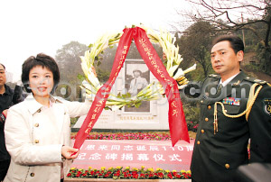 昨日下午,記者來到紅巖村主題公園,一座蒙著紅紗的碑像置于紅巖革命紀念館的青松翠柏之中。儀式開始后,周恩來的扮演者劉勁等電視劇主要創作人員一身戎裝站立碑前,身后是上百位重慶“周恩來班”的學生和解放軍戰士。行禮完畢,劉勁一行揭開紅紗,一座漢白玉打造的石碑屹立在人們面前,碑上是周恩來的一幅英姿挺拔的照片。劉勁與鄧穎超的扮演者黃薇為紀念碑獻上花環。在碑前,劉勁深情朗誦了郭沫若的著名詩歌《贊紅巖》,打動了現場的每一位觀眾。