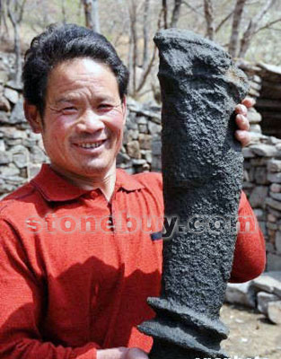 4月10日,奇石愛好者王永新在展示“奧運火炬”奇石。山東省棗莊市山亭區(qū)核桃樹村農民王永新是一位奇石愛好者,平時常到村莊附近的山上收集各類奇石。4月9日,他撿到了一塊讓他分外驚喜的花崗巖,這塊圓形的花崗巖石頭長56厘米,直徑13厘米,酷似奧運火炬。目前,奧運火炬正在世界各地傳遞,此刻得到這么一塊奇石令王永新格外激動。