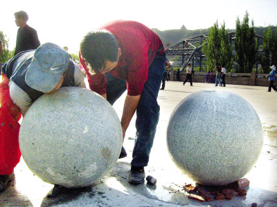 為了美化中山橋,5月12日,幾名工人將裝飾花盆更換成更加美觀的大理石圓球。據了解,蘭州市政工程管理處用15個大理石圓球代替了原來的花盆裝飾,既美觀又能防止機動車進入中山橋。