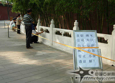 首創(chuàng)納米科技的工作人員仔細(xì)研究了漢白玉石欄現(xiàn)場(chǎng)情況,針對(duì)各種漢白玉石欄污染源采取了有效的污染處理方法和手段,使用了各種納米防護(hù)和養(yǎng)護(hù)材料,園內(nèi)處理過的漢白玉石欄雖無法恢復(fù)當(dāng)初的色態(tài),但已有效提高了漢白玉作為高檔裝飾材料的美觀且有效的阻止石欄繼續(xù)風(fēng)化、銹蝕和病變,另外各種外在的污染物無法滲透到石欄內(nèi)部而造成污染,為保潔工作帶來了方便。借施工單位負(fù)責(zé)人的話說,漢白玉石欄經(jīng)過多道程序護(hù)理后,穿上了厚度在3~10mm厚度的隱形的“納米服”,相當(dāng)一段時(shí)間內(nèi)能防止外部環(huán)境侵蝕和污染。www.stonebuy.com