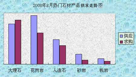 從圖1分析,我們可以得出結論:八月石材http://www.stonebuy.com/市場http://www.stonebuy.com/enterprise/FuJian/QuanZhouShi.html供應量與上月相比有小幅上升,增幅達6%左右;需求量大減,降幅達45%。受奧運停工影響,8月建筑用石材http://www.stonebuy.com/和裝飾用石材http://www.stonebuy.com/求購量比七月有明顯下降;八月的供求量同5、6兩月相比變化并不太大。