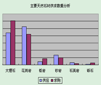 在石材http://www.stonebuy.com/市場http://www.stonebuy.com/enterprise/FuJian/QuanZhouShi.html中,大理石和花崗巖一直是熱門產(chǎn)品http://www.stonebuy.com/sample/,這兩種石材http://www.stonebuy.com/的應用范圍較廣,常用于建筑物外墻墻面裝飾、室內(nèi)外地面鋪裝和一些大型雕塑等。其中大理石的供求比為1:1.37(圖表2),供應量稍顯不足,但總體仍保持持平;花崗巖的供求比為1:0.8(圖表2),供應量稍大。雖然花崗巖堅硬耐磨,但其具有的天然輻射性,使花崗巖更適宜作為室外的墻、地面裝飾材料。