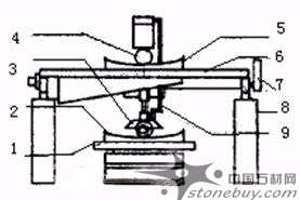 2)仿形切機(jī)加工 仿形切機(jī)可進(jìn)行石材http://www.stonebuy.com/曲面的加工,圖2為其結(jié)構(gòu)簡(jiǎn)圖。根據(jù)所需曲面形狀,用其它材料制作同形樣板5,并固定在橫梁6上;與鋸片3同直徑的靠輪4,由電機(jī)驅(qū)動(dòng)沿樣板5作曲面運(yùn)動(dòng),并控制液壓缸9上下位移;以帶動(dòng)金剛石鋸片3的主軸作垂直進(jìn)給運(yùn)動(dòng)。金剛石鋸片3由電機(jī)帶動(dòng),作主切削運(yùn)動(dòng)。鋸片的進(jìn)給運(yùn)動(dòng),由主軸橫向進(jìn)給運(yùn)動(dòng)和液壓缸垂直運(yùn)動(dòng)合成。因此,石材http://www.stonebuy.com/橫向廓形由樣板的形狀所決定。當(dāng)靠模輪在樣板上完成一次橫向行程后,由電機(jī)帶動(dòng)橫梁6沿縱向?qū)к?運(yùn)動(dòng),其縱向位移距離等于鋸片寬度,然后再進(jìn)行橫向切割,重復(fù)上述動(dòng)作即可切出所需尺寸的石材http://www.stonebuy.com/曲面。仿形切削適于大批量生產(chǎn),可以切割各種凹凸曲面。