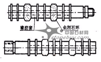 金剛石繩鋸長(zhǎng)度一般根據(jù)需要來(lái)選定。因其較長(zhǎng),多做成很多分段,繩鋸是由各分段間利用其端面緊固用的鋼套(或銅套)管螺紋連接,并將繩鋸張緊。繩鋸在安裝前要檢查各個(gè)環(huán)的外徑使其大小均勻一致,其差要小于0.2mm,目的是保證全長(zhǎng)上各金剛石環(huán)均勻磨損。繩鋸總長(zhǎng)應(yīng)是所需長(zhǎng)度的1~1.5倍,使其能寬松地安裝在設(shè)備上為宜。但另一方面要盡可能的短,以防止工作時(shí)彈跳使繩鋸損壞(見圖5)。