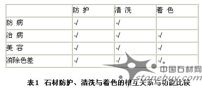 表1為石材http://www.stonebuy.com/防護、清洗與著色的相互關(guān)系與功能比較。