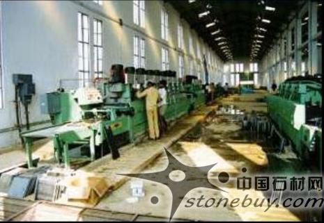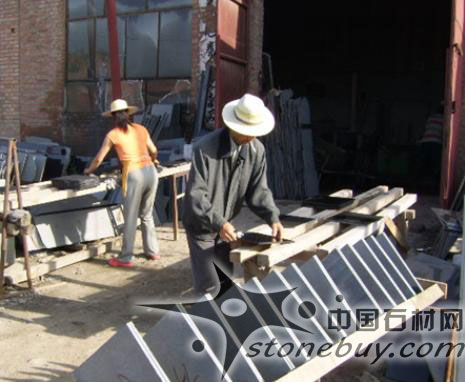 用石材http://www.stonebuy.com/(花崗巖)薄板鋸把選頂的荒料切割成10毫米厚的毛板,之后再人工把毛板一片一片敲下來。
