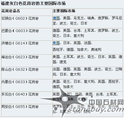 我國的灰白色花崗巖是我國石材http://www.stonebuy.com/出口http://en.stonebuy.com/中非常重要的組成,每年出口http://en.stonebuy.com/的灰白色花崗巖的數(shù)量非常的龐大,不過由于國內(nèi)的石材http://www.stonebuy.com/出口http://en.stonebuy.com/企業(yè)http://www.stonebuy.com/enterprise/普遍規(guī)模偏小,而且目標(biāo)市場http://www.stonebuy.com/enterprise/FuJian/QuanZhouShi.html的市場http://www.stonebuy.com/enterprise/FuJian/QuanZhouShi.html信息對各個企業(yè)http://www.stonebuy.com/enterprise/來說都是機密性的資料不能公開,所以大家一直沒能很好的總結(jié)出各石材http://www.stonebuy.com/品種的主要需求地或是各國的石材http://www.stonebuy.com/市場http://www.stonebuy.com/enterprise/FuJian/QuanZhouShi.html信息。所以在石材http://www.stonebuy.com/外貿(mào)開拓上,不能很好的有針對性的推廣自己的產(chǎn)品http://www.stonebuy.com/sample/,這里我將根據(jù)Google的搜索資料給大家介紹一下,福建http://www.zongyi.com.cn/幾款灰白色花崗巖的主要國外市場http://www.stonebuy.com/enterprise/FuJian/QuanZhouShi.html。