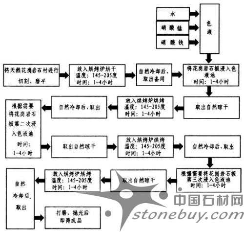 本發明提供了一種天然石材http://www.stonebuy.com/染色新工藝,能對花崗巖、大理石板材進行快速染色,采用科學配方和操作工藝,以自然滲透法對低檔石材http://www.stonebuy.com/進行染色固色處理,使之成為顏色鮮麗的高檔石材http://www.stonebuy.com/,保證染深染透染飽,保色固色好,耐光照,耐腐蝕,風吹日曬雨淋不會褪色,成本低,經濟效益高。