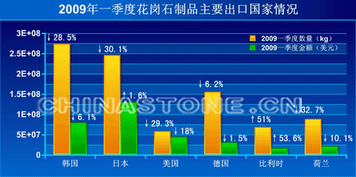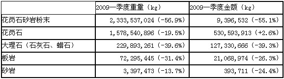 石材http://www.stonebuy.com/制品出口http://en.stonebuy.com/各類的數(shù)量和金額如下,括號中為與2008年同期相比變化: