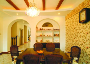 設計思路:在餐廳入口處做了圓拱形埡口,為了讓視覺上不突兀,埡口旁邊的墻壁設計一個拱形酒柜,與門廳埡口呼應,組成雙拱構圖。在酒柜上方的小拱形開窗可改善隔壁衛生間的采光。利用多個圓拱形結構達到重復,但在大的重復前提下,又各有特點。