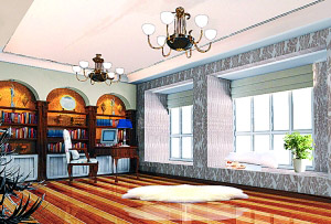 設計思路:該設計的重點是書房的靠墻書架,利用三個圓拱形造型和4個簡化的羅馬柱將整面墻的書架分成三部分,避免了整排書架帶來的壓抑感。而拱形墻面中的大面積黃色與咖啡色的簡化羅馬柱更突出了書房的溫馨與穩重的美式格調。